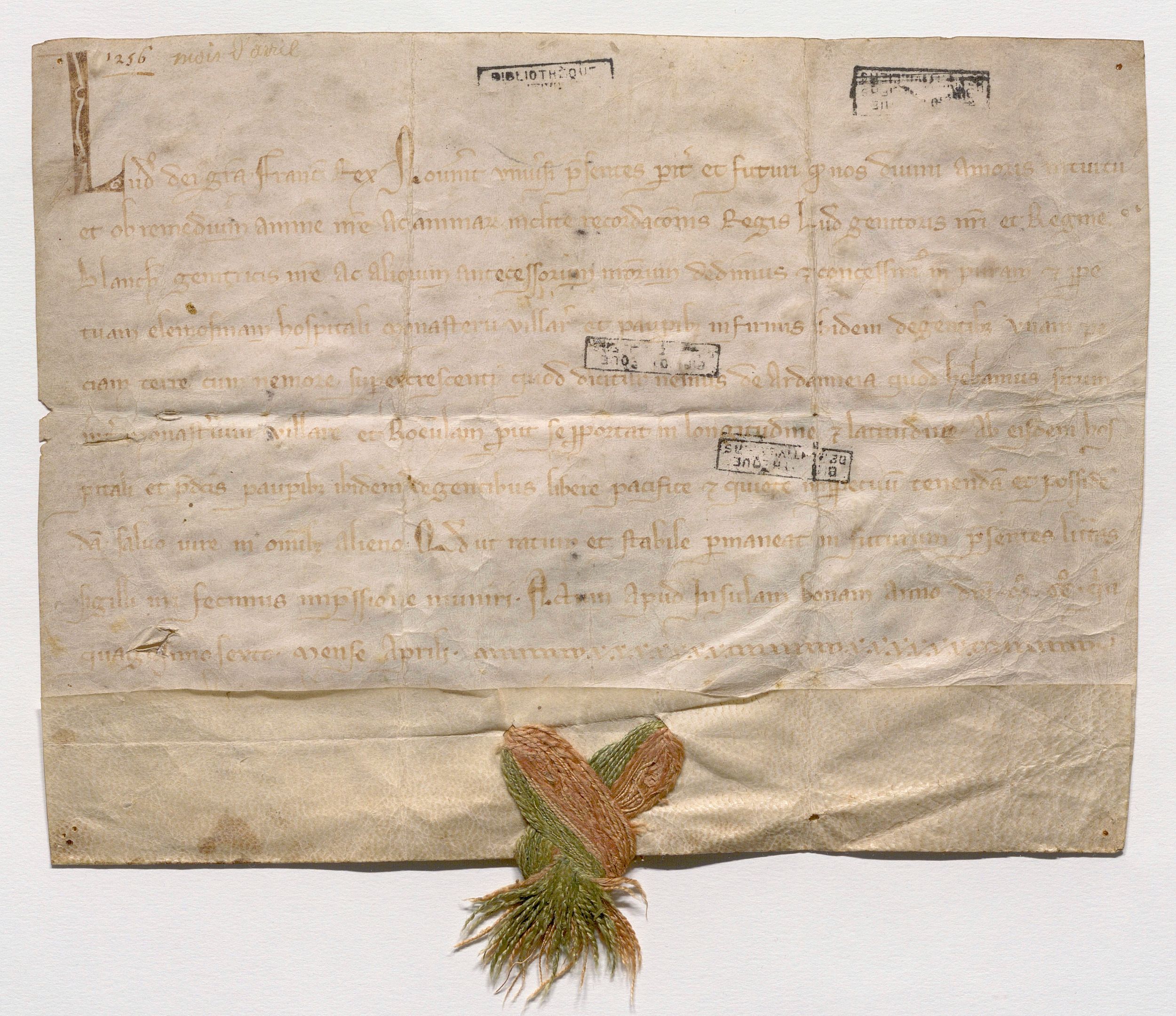 Ludovicus, Dei gratia Francorum rex. Noverint universi presentes pariter et futuri quod nos divini amoris intuitu et ob remedium anime nostre ac animarum inclite recordationis regis Ludovici, genitoris nostri, et regine Blanche, genitricis nostre, ac aliorum antecessorum nostrorum dedimus et concessimus in puram et perpetuam elemosinam hospitali Monasterii villaris et pauperibus infirmis ididem degentibus unam peciam terre cum nemore super excrescenti quod dicitur « nemus de Ardanneia » quod habebamus situm inter Monasterium villare et Roeulam pro ut se proportat in longitudine et latitudine. Ab eisdem hospitali et predictis pauperibus ibidem degentibus libere, pacifice et quiete im perpertuum tenendam et possidendam salvo jure in omnibus alieno. Quod ut ratum et stabile permaneat in futurum presentes litteras sigilli nostri fecimus impressione muniri. Actum apud Insulam bonam anno domini millesimo ducentesimo quiquagesimo sexto mense aprili.