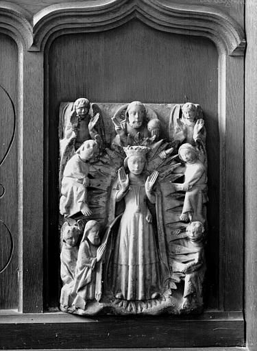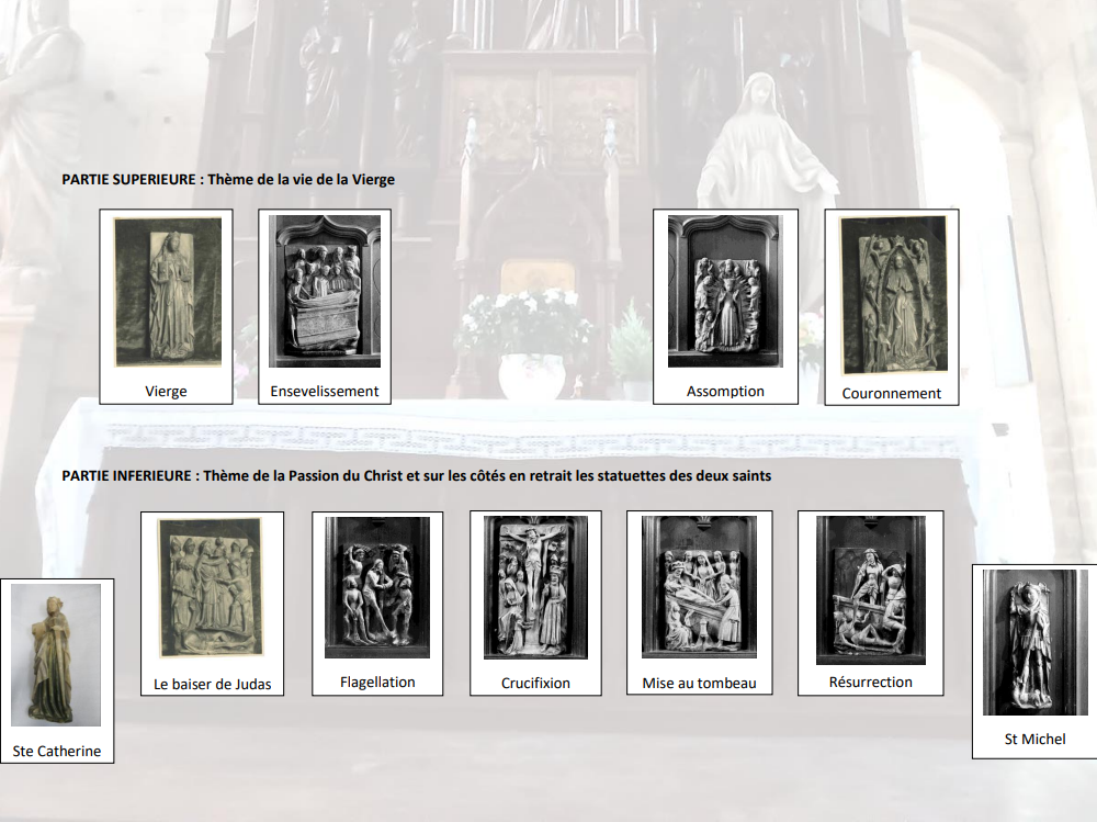 Sur la partie supérieure sont disposées quatre pièces d’albâtres représentant des scènes de la vie de la Vierge et dans la partie inférieure, entourées des statuettes de sainte Catherine et saint Michel, cinq scènes de la Passion du Christ.