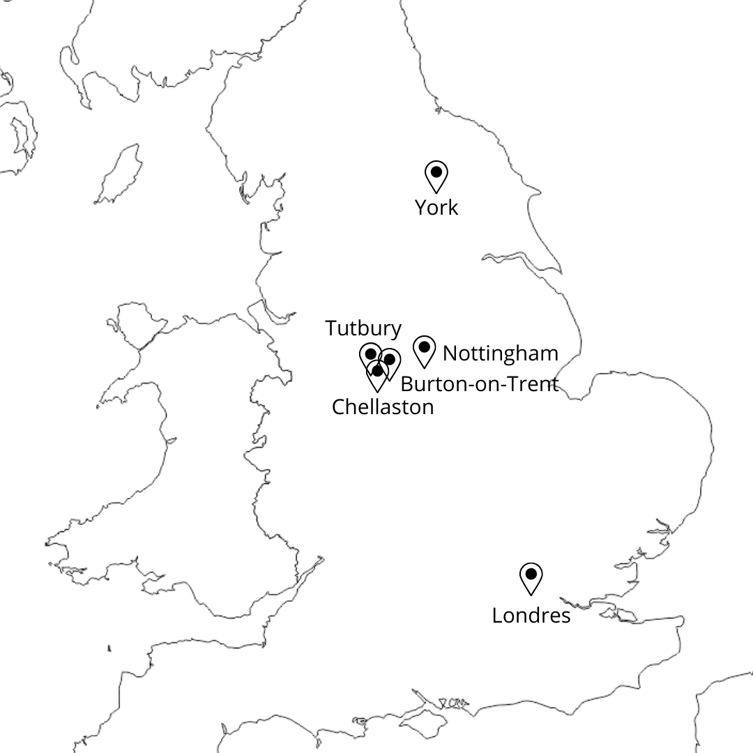 Les onze bas-reliefs de Montivilliers sont probablement issus des ateliers de Nottingham, plus grand centre de production connu, situé à proximité des carrières du South Derbyshire, non loin de Tutbury et Chellaston. Londres, York, Burton-on-Trent accueillent également de ateliers de moindre ampleur.